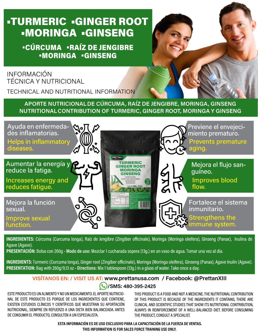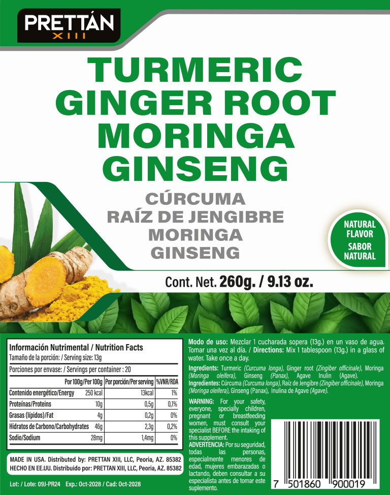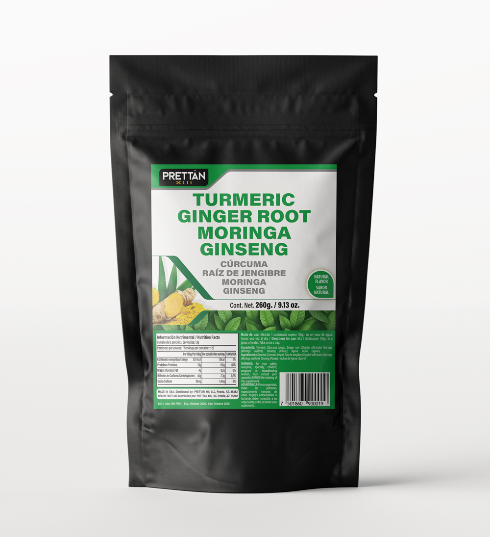 Turmeric (Curcuma longa), Ginger root (Zingiber officinale), Moringa (Moringa oleifera), Ginseng (Panax), Agave Inulin (Agave).